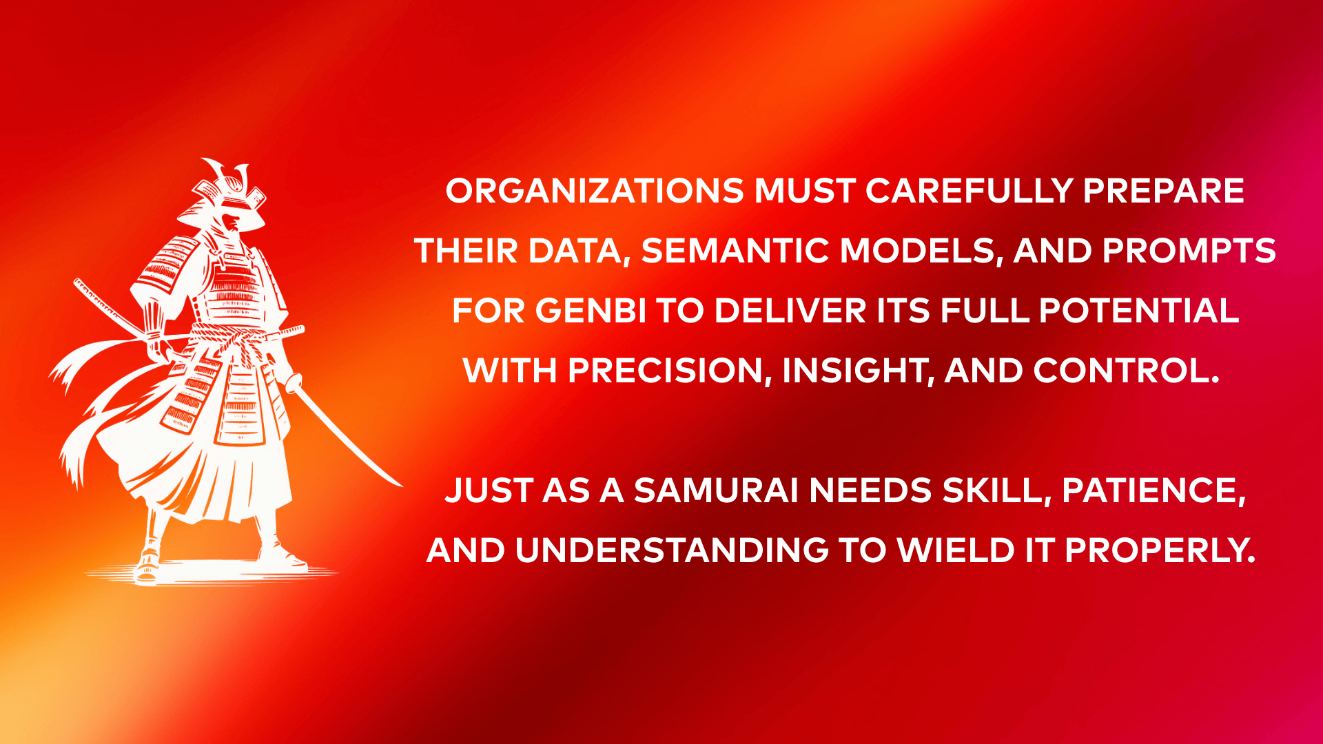 The final step rarely determines success, it is everything that comes before it that matters. Like a katana, GenBI is only efficient and effective when built on solid preparation and strong foundations. Organizations must carefully prepare their data, semantic models, and prompts for GenBI to deliver its full potential with precision, insight, and control. Just as a samurai needs skill, patience, and understanding to wield it properly. Are you in need of the right skills and understanding to turn your GenBI endeavors into a real success? Talk with Datashift, we are always open to talk and ready to help.