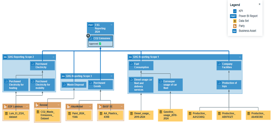 The previously mentioned points may appear distinct, yet they are intricately interconnected. To illustrate this, we've provided a simplified visual representation in Collibra, a chosen governance tool, depicting the relationships within one of the ESG indicators.