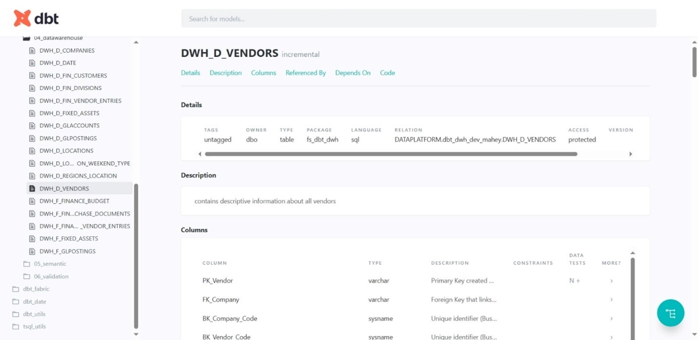 Too often, critical business logic lives in the heads of a few key individuals. When they leave or switch roles, it often creates gaps in knowledge and makes it difficult for others to understand or maintain the existing logic and code. dbt addresses this head-on with built-in documentation features. Every model, test, and transformation can be documented directly in the project repository.